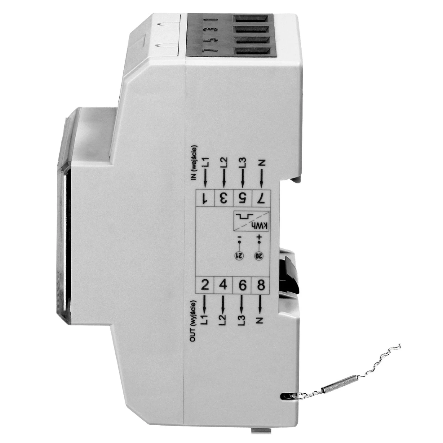 - Stromversorgung: 230V~, 50Hz, Basisstrom: 5A, maximaler Strom: 80A, minimaler Strom: 0,25A, Pulsfrequenz: 800 Imp/kWh, Genauigkeitsklasse B, Gehäuse mit einer Breite von drei Modulen, Montage auf TH-35 mm DIN-Schiene, Impulsausgang: Stromversorgung 12~27V, Strom ≤27mA, Impuls = 80ms.